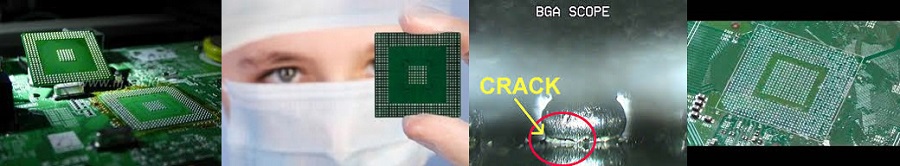 Kao što možete videti na slikama grafička karta na laptopu vrsta je integralnog kola koji se pakuje na ploču posebnim tipom takozvanog BGA pakovanja, to je zapravo naslagan niz kalajnih kuglica koje su specijalnom metodom zalemljene sa jedne strane na sam grafički čip a drugom stranom za istovetan šablon kontakata na matičnoj ploči .Usled velike potrošnje energije koju ovi čipovi troše odnosno oslobađaju u vidu toplote, s vremenom dolazi do oštećenja ovih kontakata bilo na ploči ili na samom čipu i tada nastaju kvarovi poput gubitka slike na ekranu laptopa,slike koja je puna distorzije odnosno artefakta u vidu kockica i linija na ekranu a ponekad čak i nemogućnosti laptopa da se uključi.