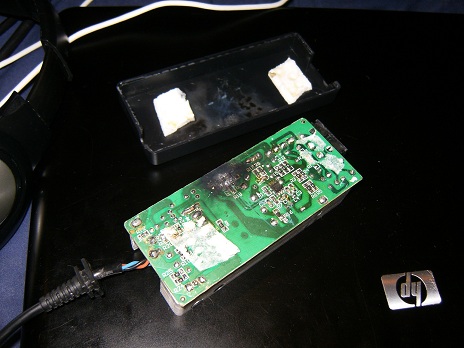 Na slici se vidi termalna podloška koja nije blagovremeno zamenjena, osušena i nagorela, čest uzrok kvara na čipsetu |